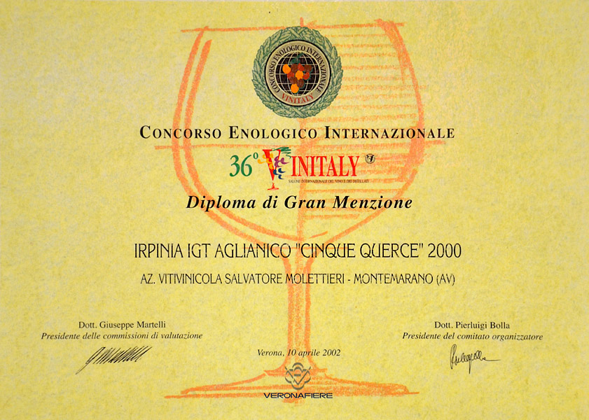 36° Vinitaly: Great Mention to Irpinia Aglianico DOC “Cinque Querce” 2000
