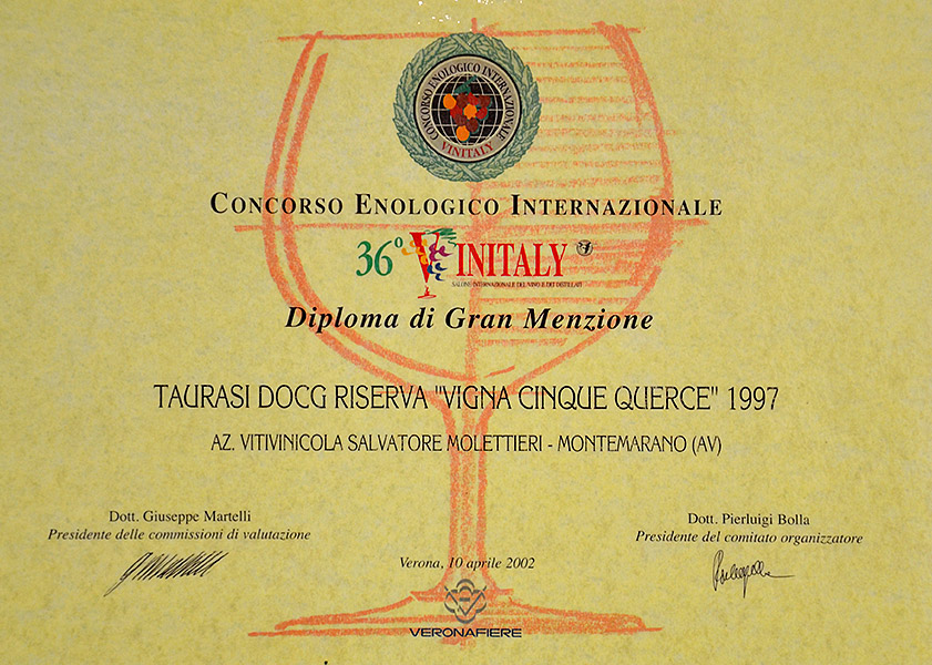 35th Vinitaly: Great Mention to Taurasi DOCG “Vigna Cinque Querce” 1997