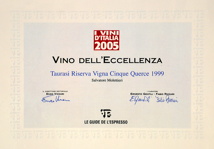 I Vini d’Italia de L’Espresso: Wine of Excellence in Taurasi DOCG Riserva “Vigna Cinque Querce” 1999