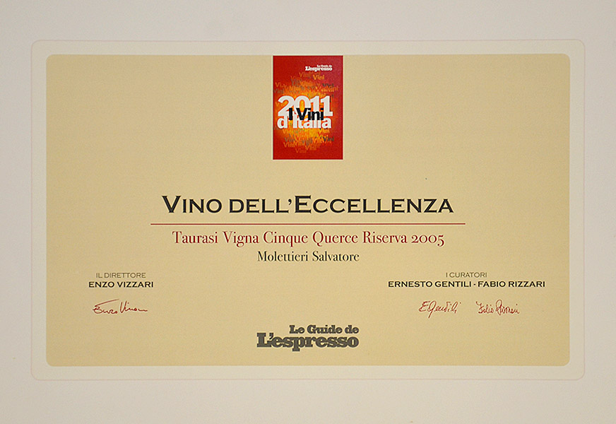 I Vini d’Italia de L’Espresso: Wine of Excellence in Taurasi DOCG Riserva “Vigna Cinque Querce” 2005