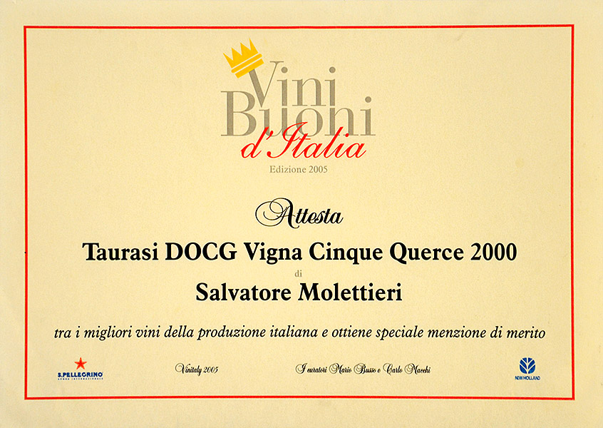 Vini Buoni d’Italia: certificate of belonging to the best wines of Italian production in Taurasi DOCG “Vigna Cinque Querce” 2000 and special mention of merit
