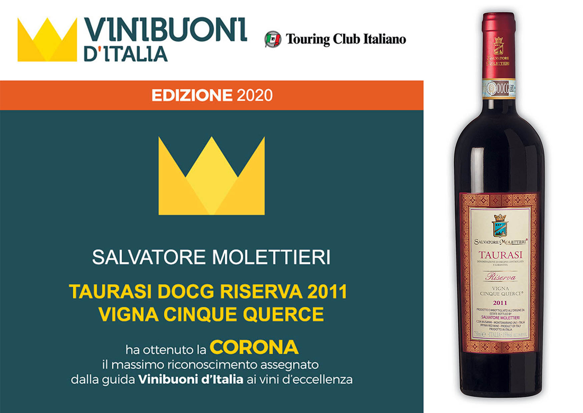 with the “Taurasi DOCG Riserva 2011 Vigna Cinque Querce” it obtained the CORONA, the highest recognition assigned by the Vinibuoni d’Italia guide to wines of excellence.